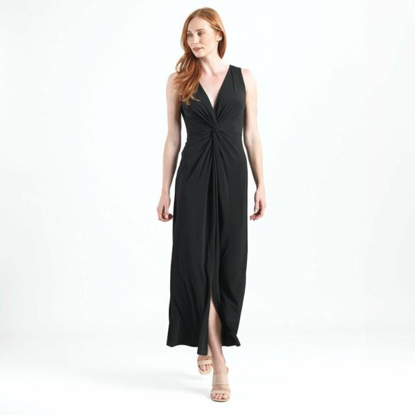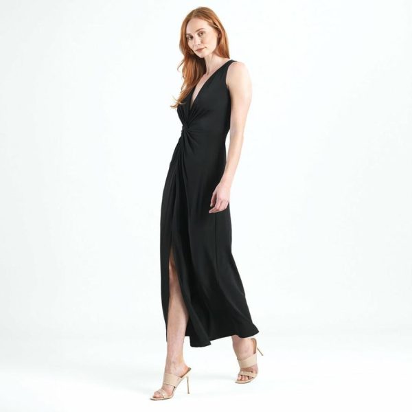 Our Center Slit Maxi Dress is a dress you’ll never mind committing to! This stunning sleeveless dress features a deep v-neckline, wide shoulder coverage, and a knotted twist bodice detail, that accentuates the waist while creating a flattering draped silhouette, with a 24The model is 5’9″ wearing Extra Small (4/6)