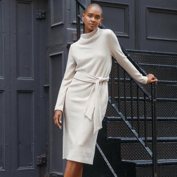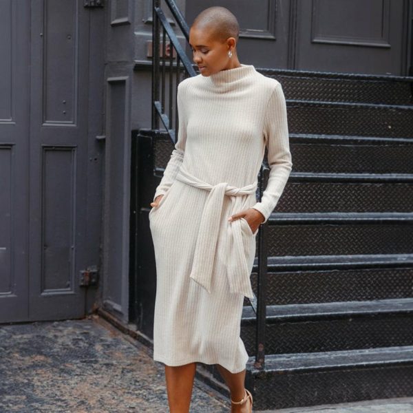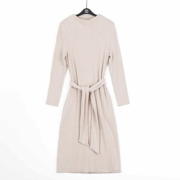 Women Chunky Ribbed – Tie Waist Pocket Midi Sweater Dress – Sand – Final Sale! | Clara Sunwoo Dresses + Jumpsuits