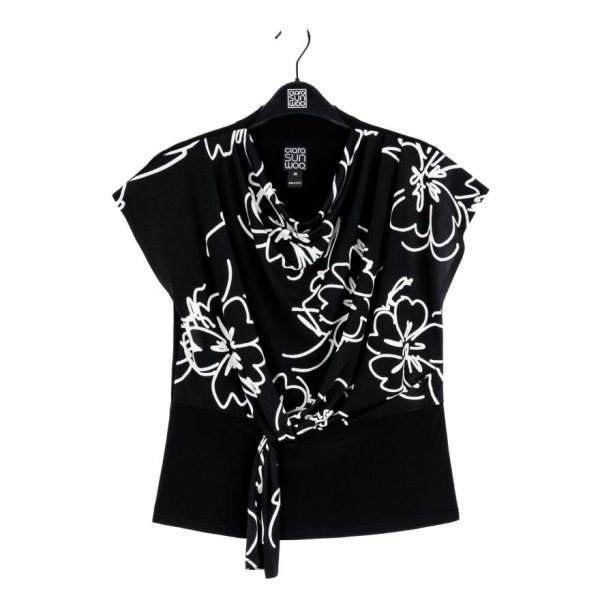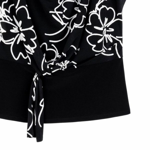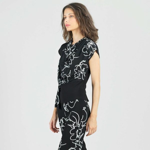 Draw just the right amount of attention in our Blossom Sketch Crepe Knit Drape Neck Loop Front Top! An innovative top featuring a printed crepe knit bodice, cap sleeves, soft pleat details on the left shoulder, a feminine draped neckline that cascades to display a unique pull-through loop front detail that creates a chic, asymmetrical silhouette with a banded waist and straight hemline.