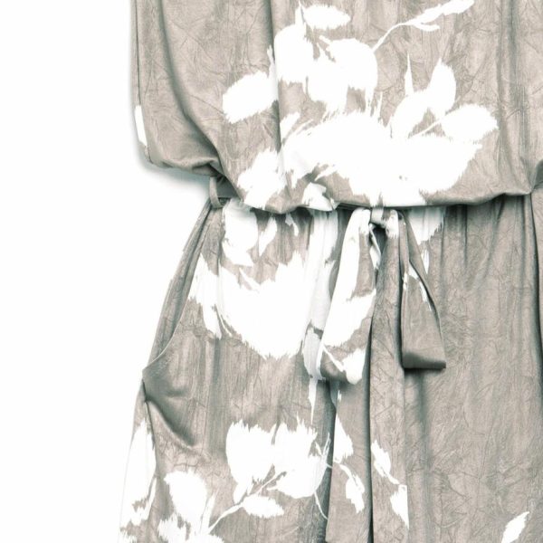 A beautiful feminine print, featuring white, large-scale flower heads, with soft petal stems, displayed against a silky stone-taupe background.