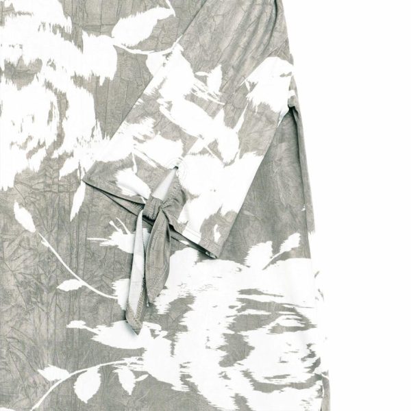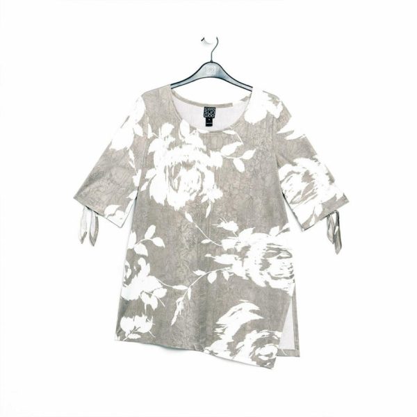 Women Crushed Silk Knit – Tie Cuff Asymmetrical Vent Tunic – Dreamy Floral-Taupe – Final Sale! | Clara Sunwoo Tops + Tunics