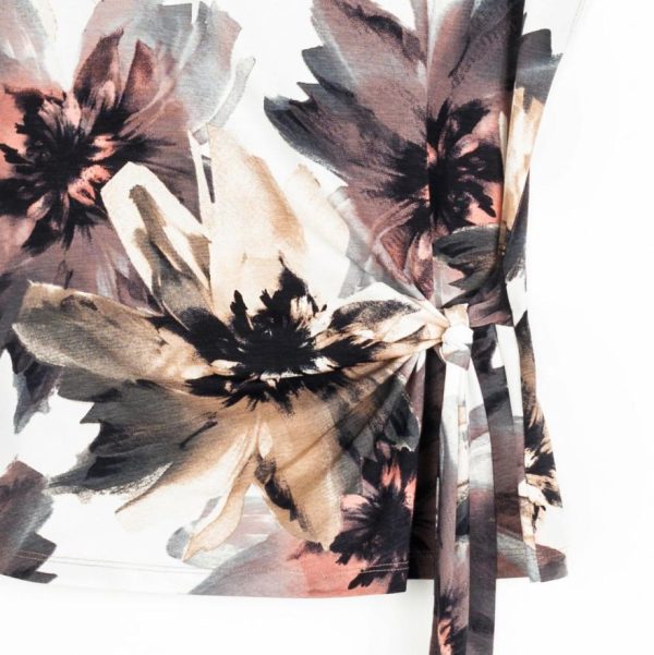 A dreamy print comprised of a floral motif in beautiful earthy tones of muted mauve, rust, greys and taupes, black and ivory created by layered brush strokes giving off an artistic feel.
