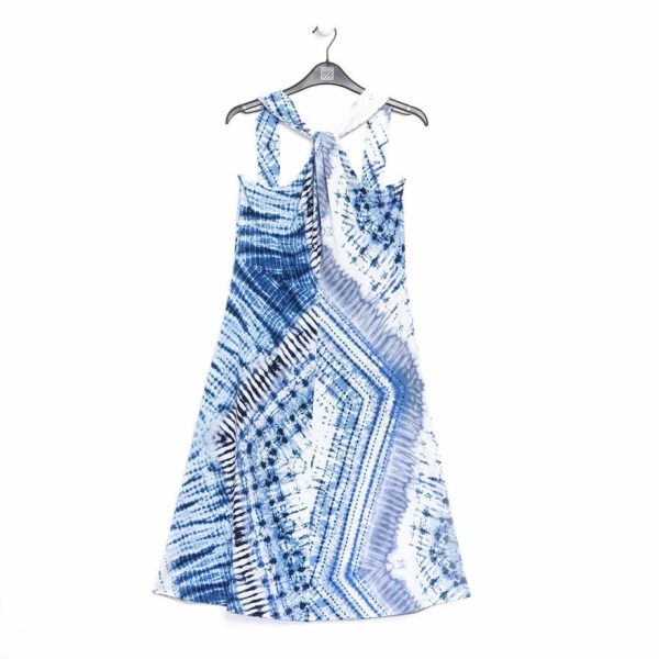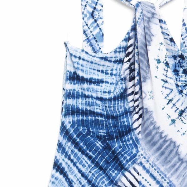 A stunning acid wash print, comprised of oceanic shades of navy, sky, baby blues, and white, with subtle hints of teal and beige, that display a tie-dye effect, in sunburst shapes.