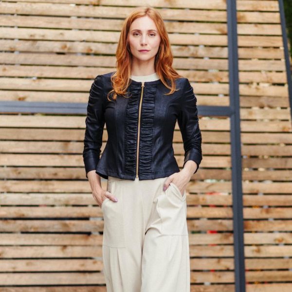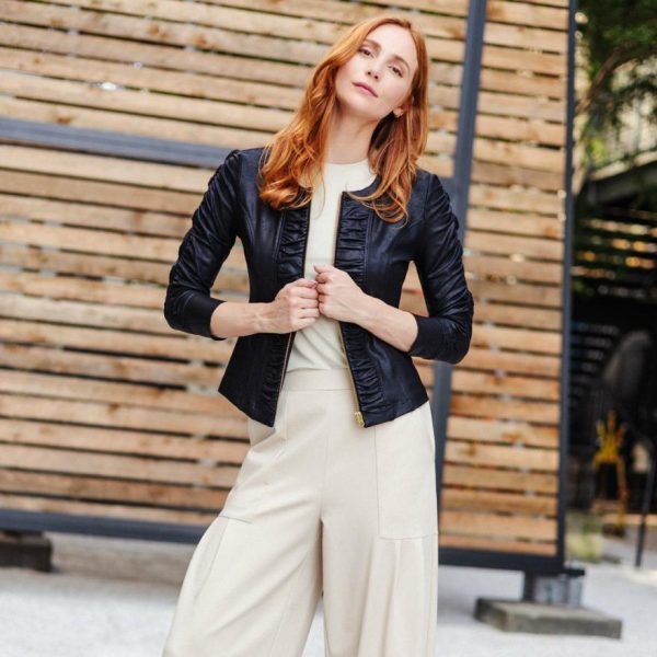 Experience our unique Liquid Leather Ruched Detail Jacket which is made from our beautiful signature stretch knit, extremely lightweight soft The model is 5’9″ wearing Extra Small (4/6)