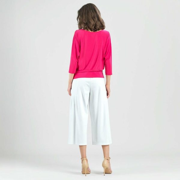 Celebrate your best features in our Open Shoulder Blouson Waist Top! Featuring an open shoulder with 3/4 length dolman sleeves, a scoop neckline with a gathered detail that creates beautiful soft pleats, front and back side diagonal princess seams, and a waist-hugging hemline, that displays an elegant blouson silhouette.