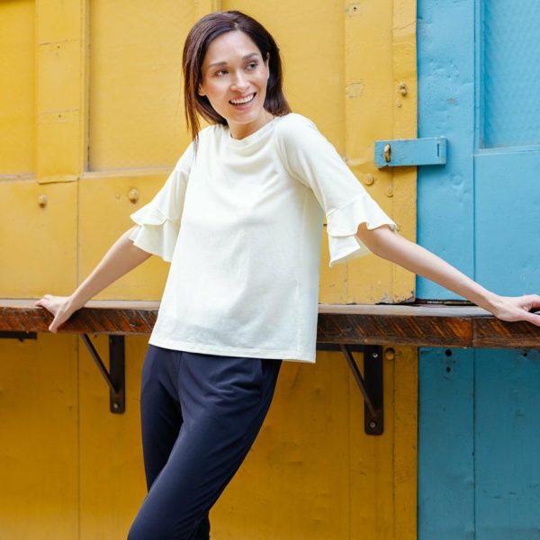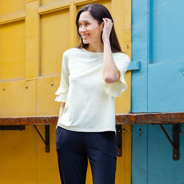 Our Peach Skin Knit Tulip Cuff Back Tie Top is a basic silhouette with unique feminine details. Featuring a high round neckline, vented elbow-length tulip cuffed sleeves, charming tie-back detail, and a straight waist hemline.