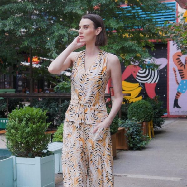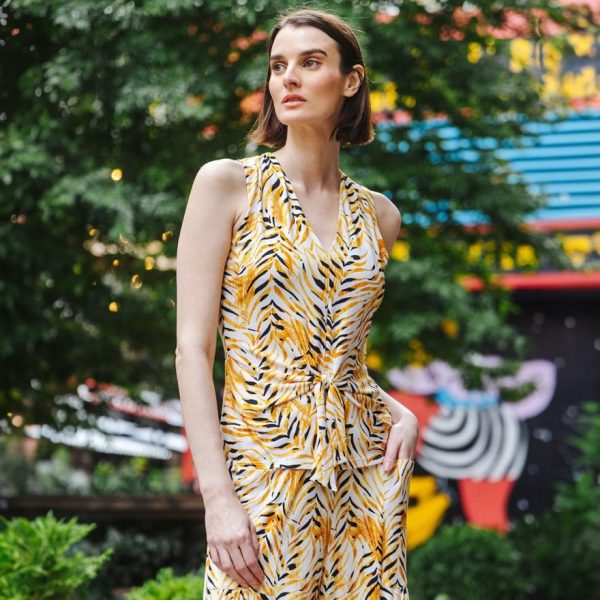 A lively print, displaying a formation of wild leaves in shades of amber, black, and ivory that create striking tiger-like stripes.