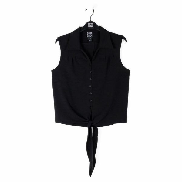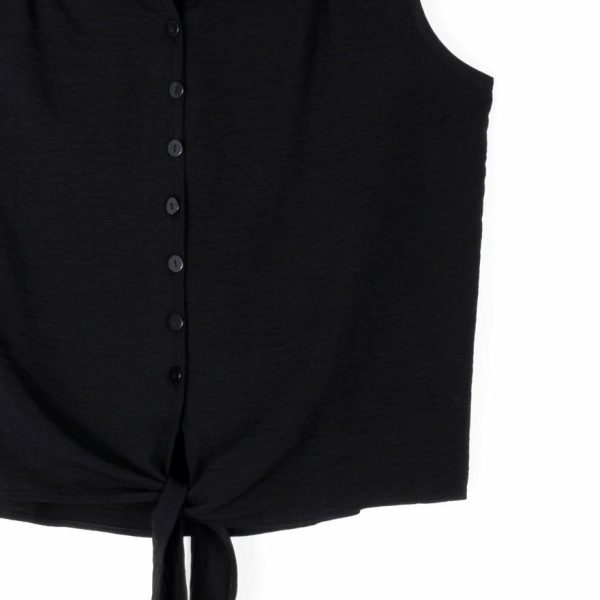 Looking for a style that is as modern as it is elegant? Our Textured Rayon Button Down Tie Hem Top is sure to tie your wardrobe together effortlessly! This sleeveless, bra-friendly top features a collared v-neckline with an 8-button down closure, a front and back yoke seam both with darted pleat details, and an adjustable tie-front hemline for a customizable touch.