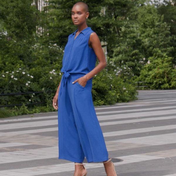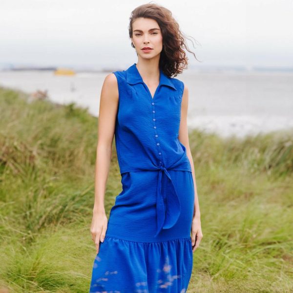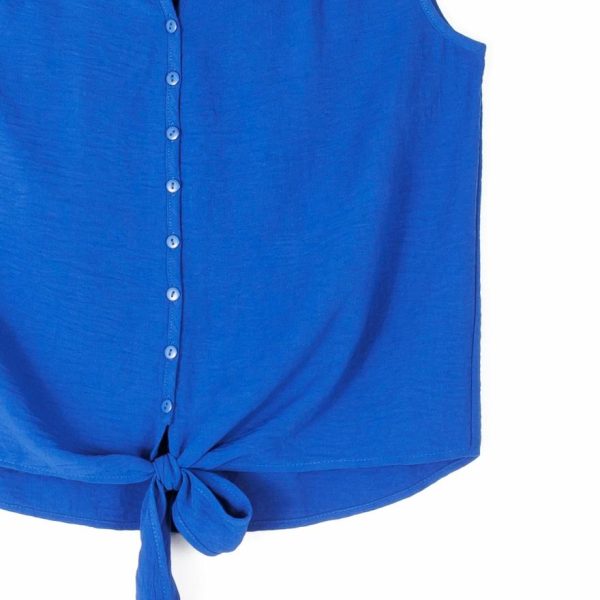 Looking for a style that is as modern as it is elegant? Our Textured Rayon Button Down Tie Hem Top is sure to tie your wardrobe together effortlessly! This sleeveless, bra-friendly top features a collared v-neckline with an 8-button down closure, a front and back yoke seam both with darted pleat details, and an adjustable tie-front hemline for a customizable touch.
