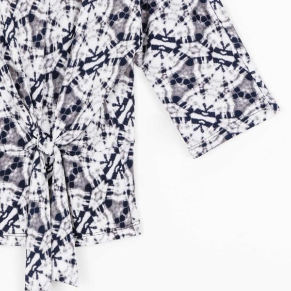 A unique print comprised of an array of circular emblem shapes in shades of grey, dark navy, and a white embossed texture that creates a 3-dimensional contrast.