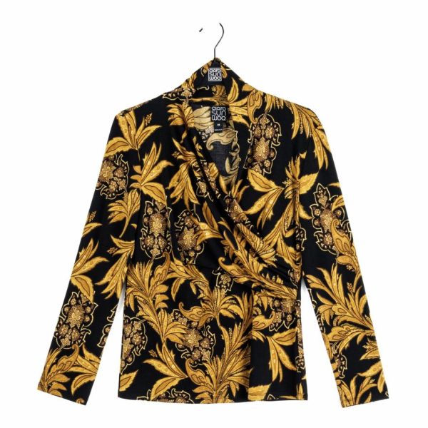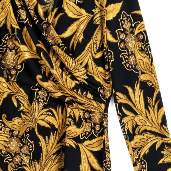 An opulent print that features intricate baroque motifs intertwined by dynamic paisley shapes in rich shades of gold and black, which evoke a sense of regal sophistication.