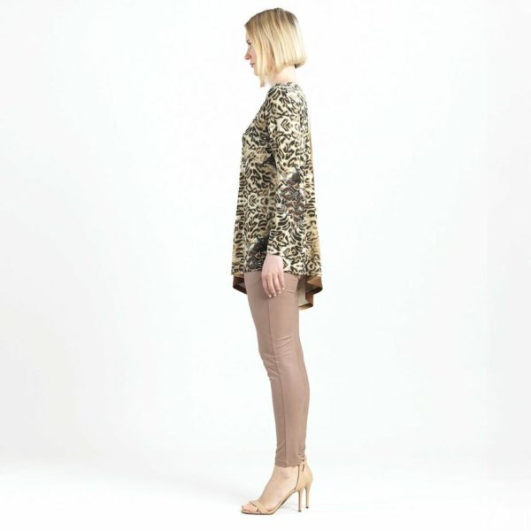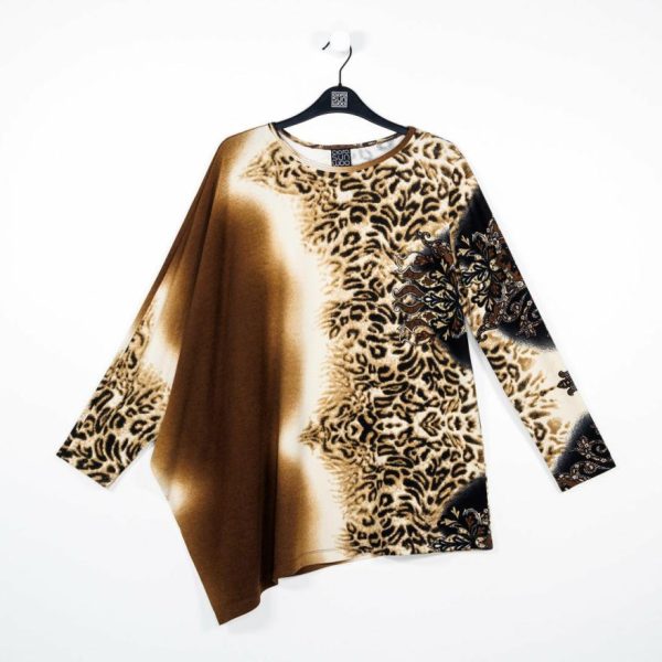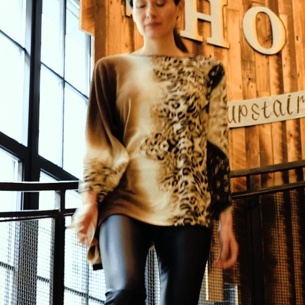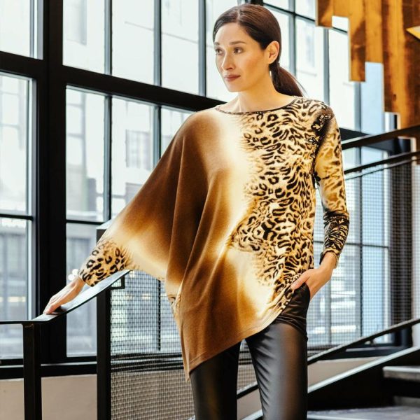 Make a stunning statement with our Animal Ombré Cozy Knit Poncho Sleeve Sweater Tunic! This distinctive design showcases a wide, round neckline and innovative sleeve styling featuring a standard left sleeve paired with a dramatic right poncho sleeve that flows into an elegantly draped angled hemline.