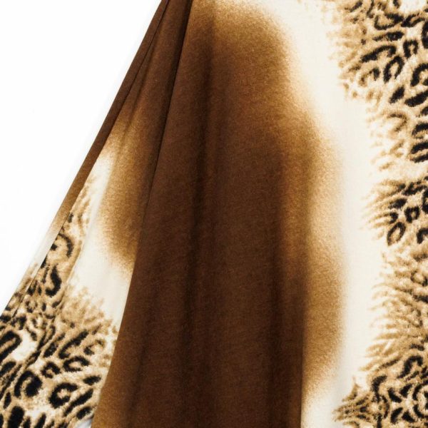 The captivating ombré pattern showcases a sophisticated blend of animal spots in cream, ivory, and black tones that gradually transition through warm tawny and tortilla brown shades, accented with subtle paisley details that create a rich, dimensional color narrative.
