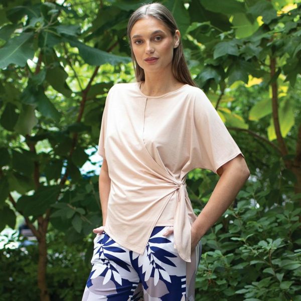 Experience minimalist elegance with our Peach Skin Knit Side Tie Wrap Top, designed for effortless style and perfect fit. This versatile top features a classic round neckline, comfortable short sleeves, and an innovative adjustable side tie wrap that creates a flattering angled hemline you can customize to your preferred silhouette.